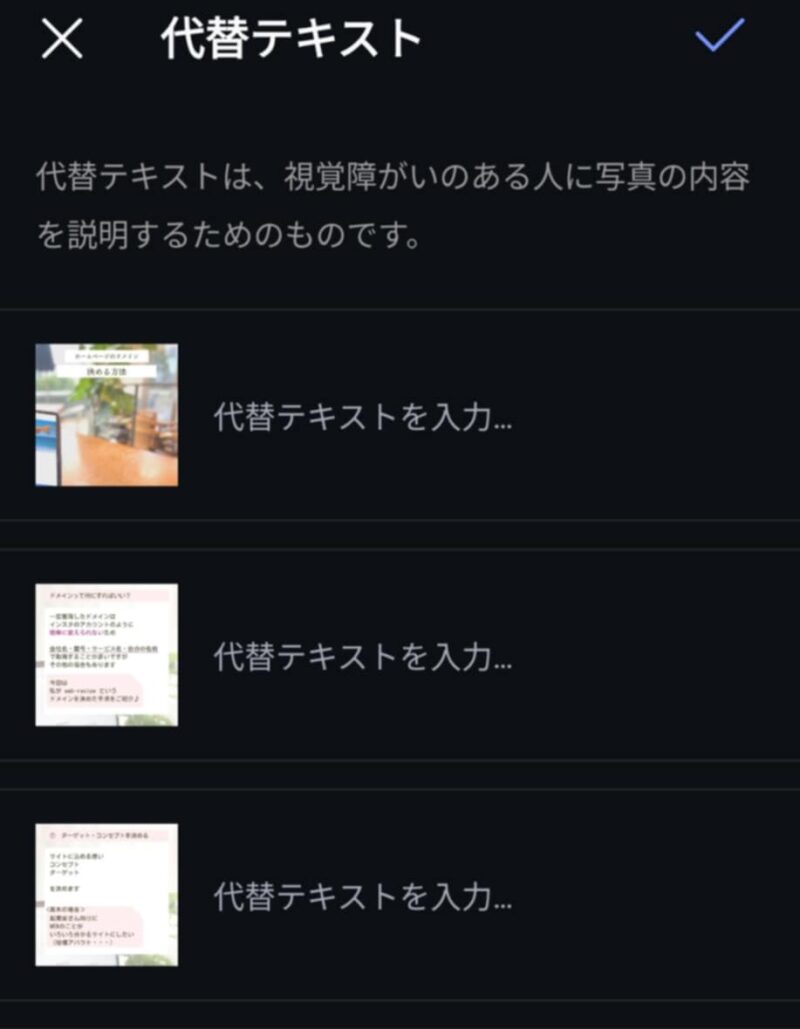 ・代替テキストを入植したら、右上の「完了」をタップ